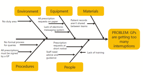 The fishbone tool, developed by Kaoru Ishikawa, is a cause and effect analysis that helps you to understand a range of the causes to a problem, not