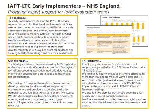 In this case study, we describe the challenge, our approach and the outcome from our providing support to local evaluation teams for NHS England.
