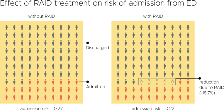 Our study found, for patients treated by the Rapid Assessment Interface and Discharge service in the ED their average risk (or chance) of admission was 18.7% lower (95% confidence interval –9.3% to –27.3%). Average length of stay for a wider group of patients treated on general wards (including those benefitting indirectly from the presence of 'Rapid Assessment Interface and Discharge' Service) was 10.8% lower (95% confidence interval